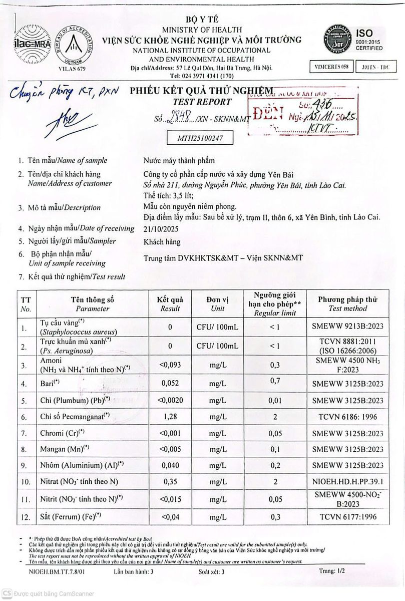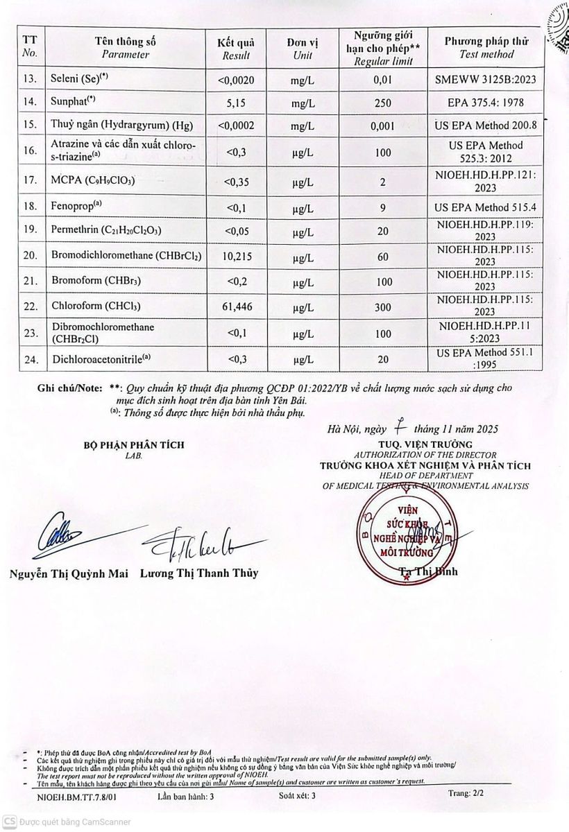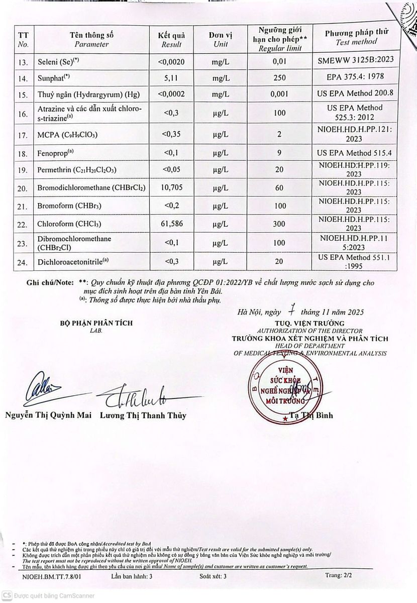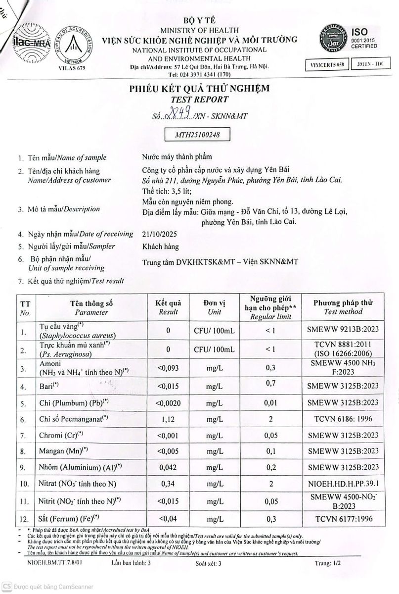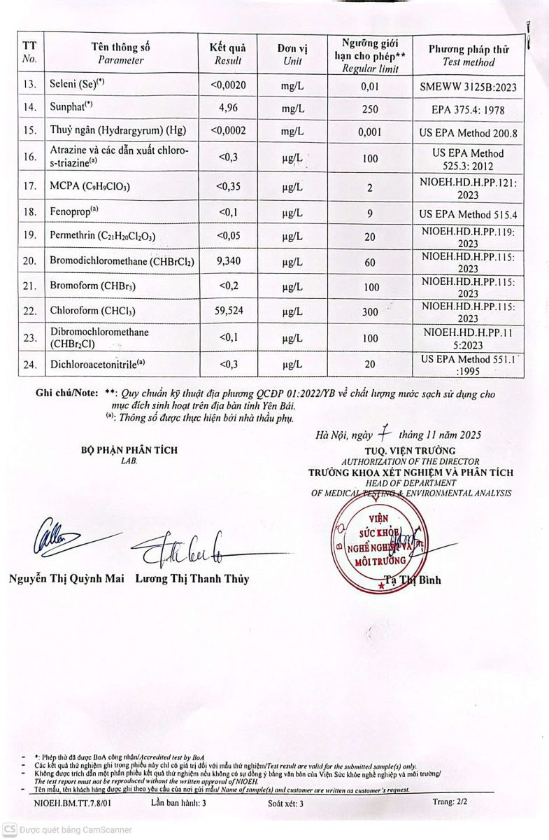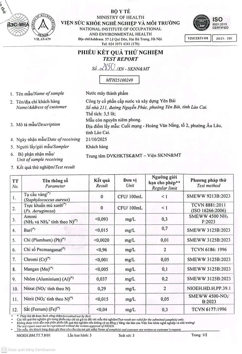 Thứ hai, 24/11/2025 | 15:16 A- A A+ | Kết quả kiểm nghiệm chất lượng nước 6 tháng 1 lần với 24 chỉ tiêu (theo tiêu chuẩn địa phương) tháng 10 năm 2025 Đọc bài Lưu Tổng số điểm của bài viết là: 1 trong 1 đánh giá Click để đánh giá bài viết